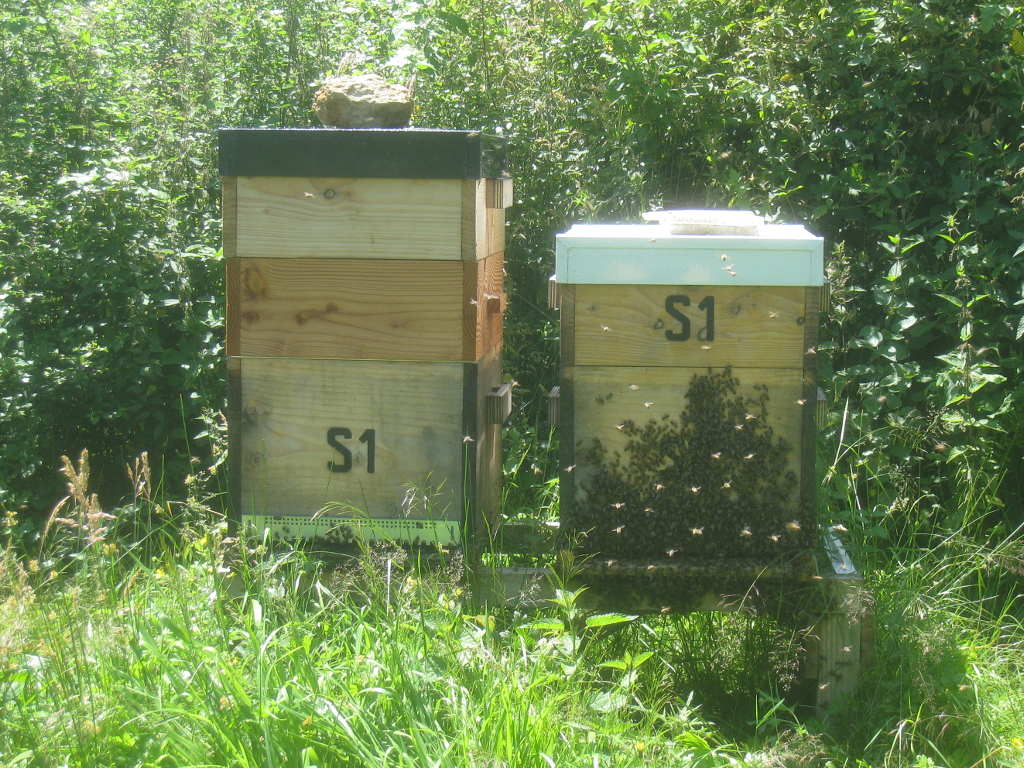 Au moment même où l'essaim capricieux revient sous la ruche S2 (voir article précédent), un autre essai sort de ma ruche P2 :