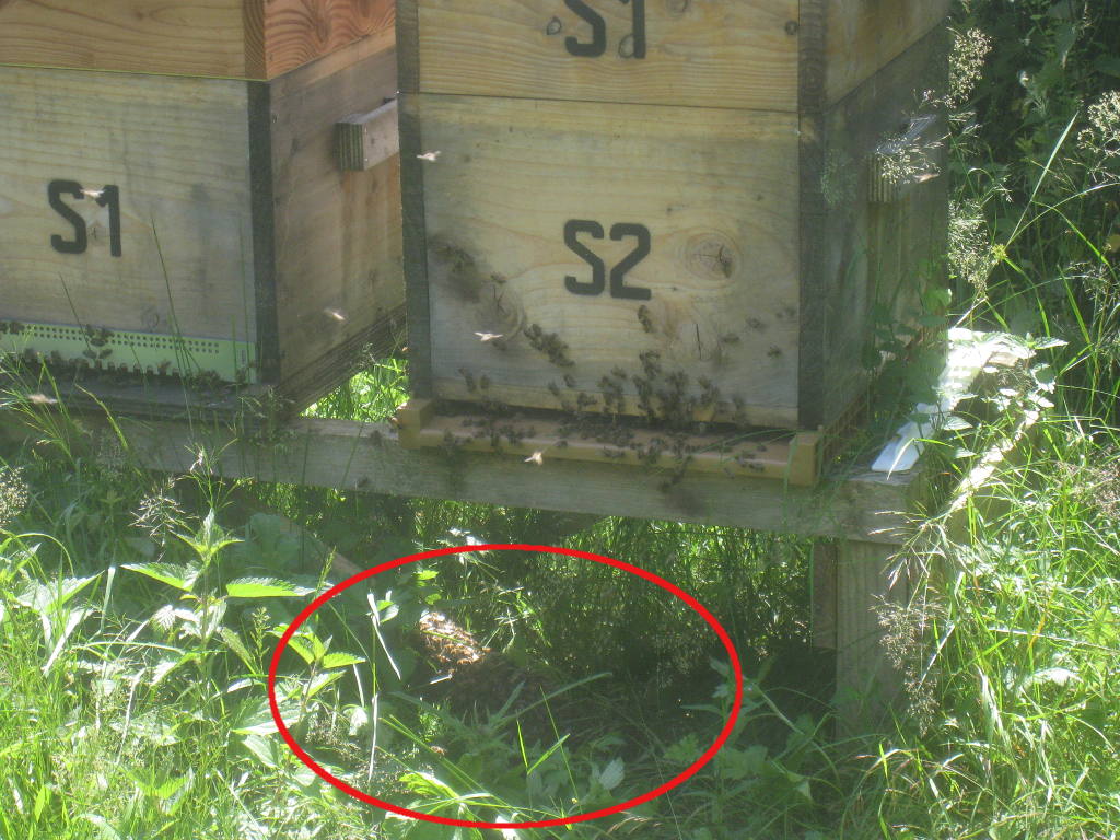 Voilà un essaim bizarre qui est sorti de sa ruche Dimanche sans décoller, mais en s'installant directement sous sa ruche, au raz du sol, à moitié noyé dans l'herbe :